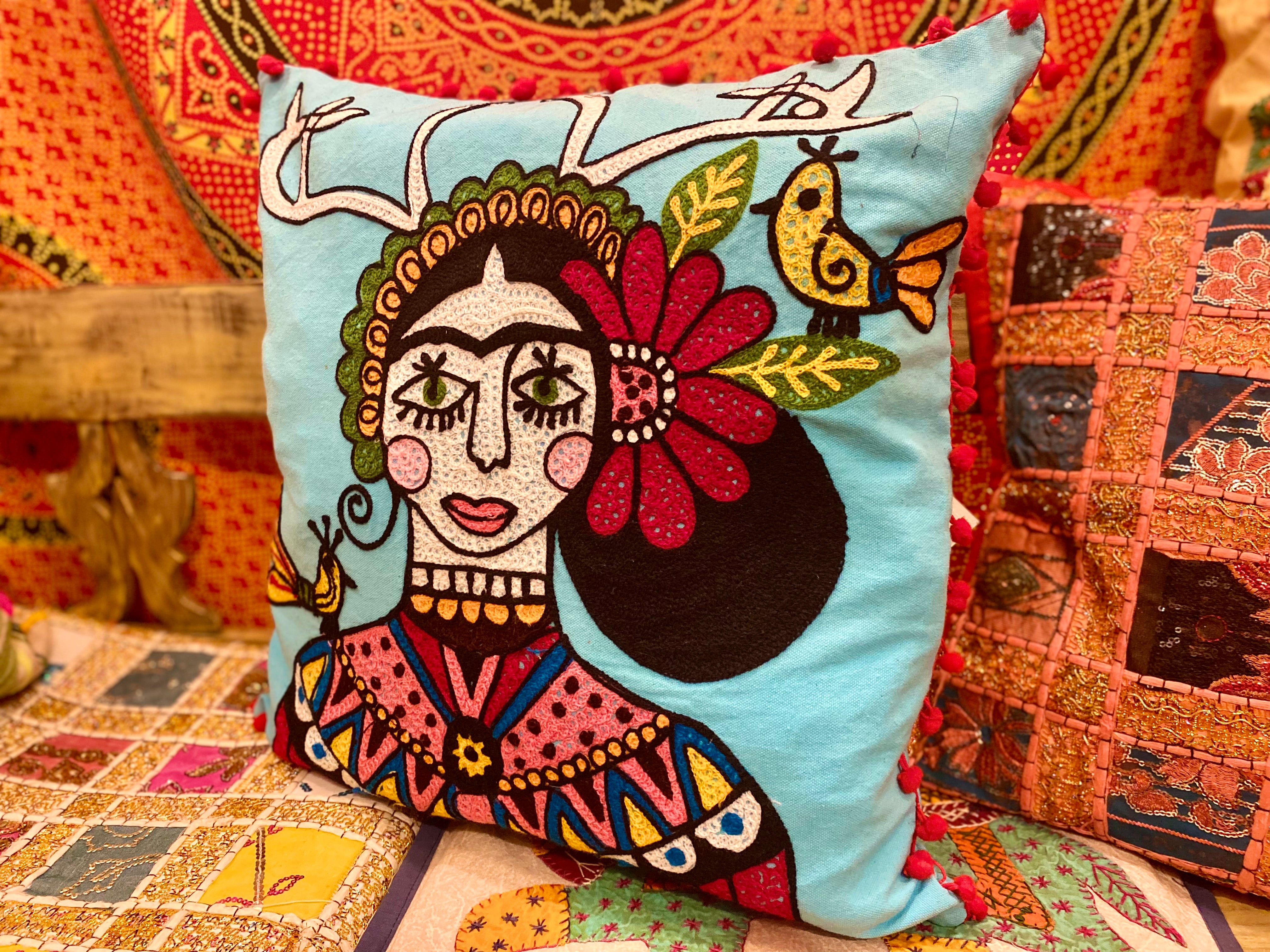 Frida pillow case are made from natural cotton fibre that come in several different colours with intricate portrait of the artist Frida Kahlo. These portraits are a playful artistic interpretation of her unique personality, style and art that she was bravely and fully living and expressing in her very day life. Due to the fine embroidery it is recommended to wash them by hand in cold water.