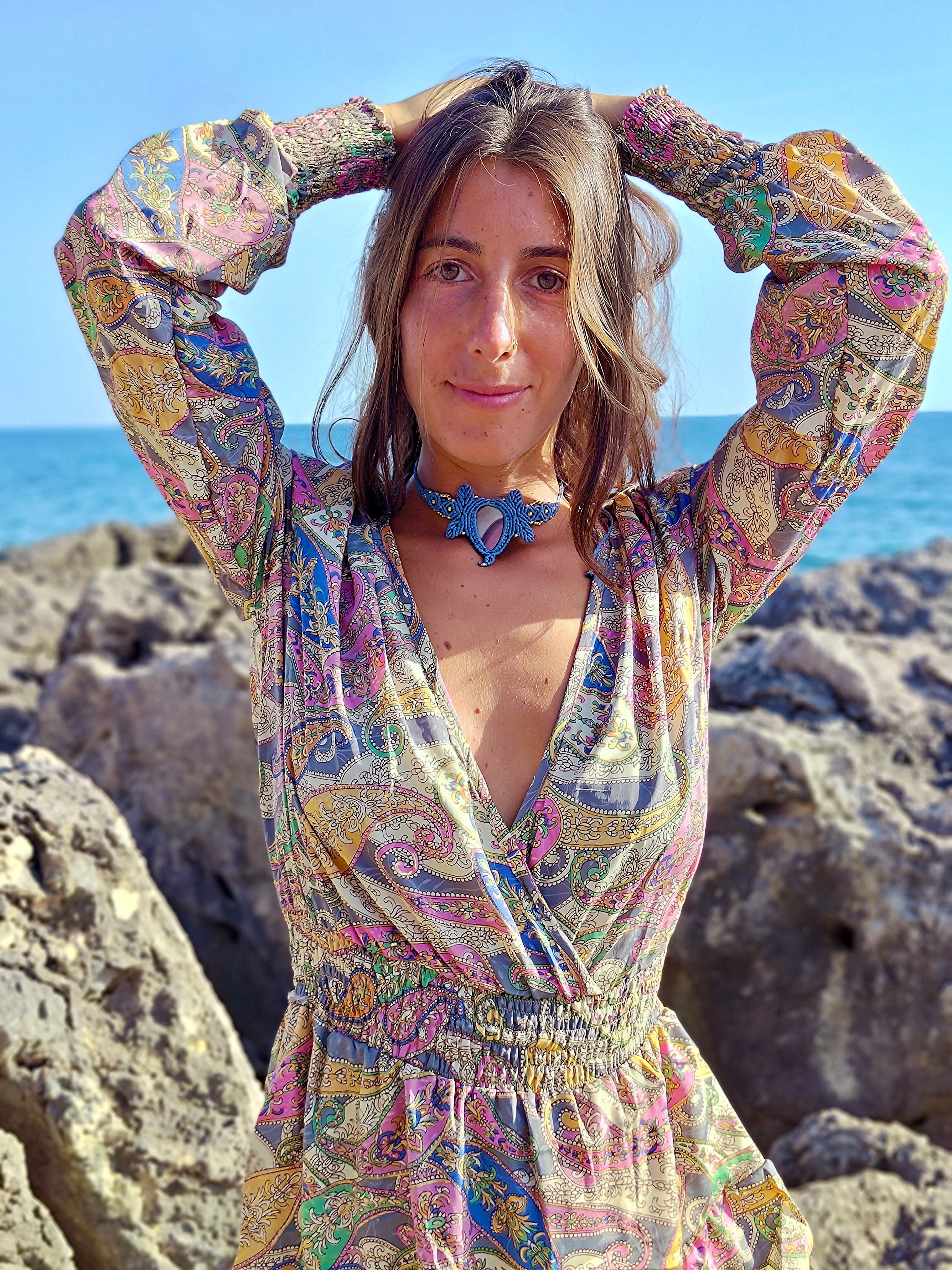 This is a light dress for summer chilly evenings, spring, fall, it goes well in combination with leggings and jeans jacket. The dress accentuates the waist line, it has a low cut cleavage, so do mind if you don't like that you can easily stitch the opening and prevent the dress from exposing too much. It comes in either viscose or polyester material, which is made as an imitation of silk. The material is high quality, thin and static free, which can be annoying on many other types of polyester. The material is very comfortable on skin and easy to maintain, suitable for machine wash, without ironing. Viscose is natural thin also comfortable on skin, favourite summer material for many, washing is possible in the machine wash on sensitive program, and it doesn't need ironing.