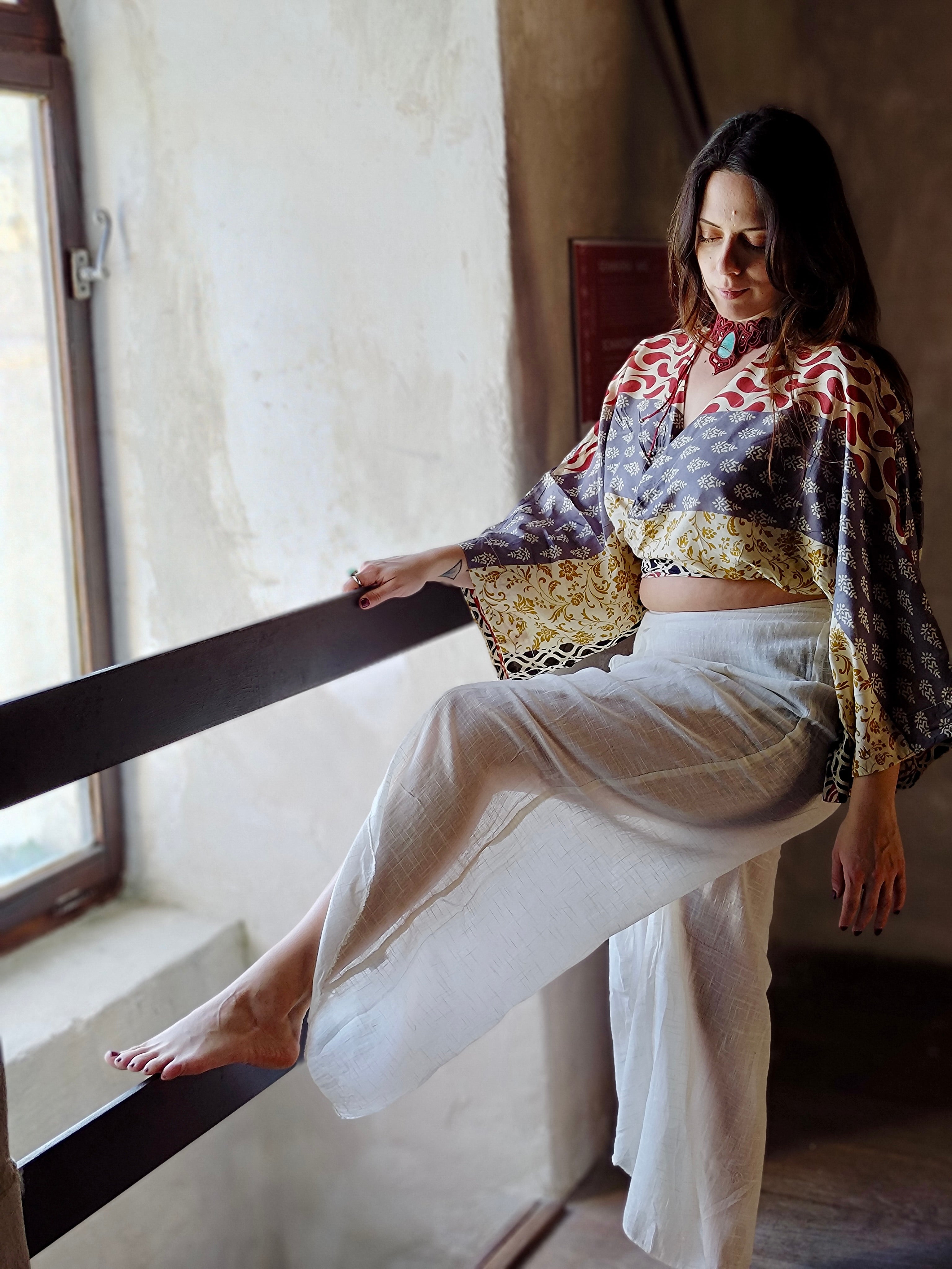 These summer trousers are very light and airy item for hot days, light exercise, stretching, Yoga or Tai Chi. They are made from cotton, natural fabric, they don't stick to the skin, great for outdoor activities and beach. You can pair them with a crop top or a light shirt. They come in two sizes medium (S/M) and large (M/L).