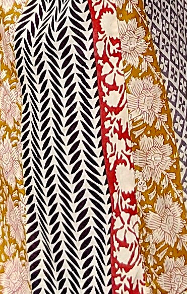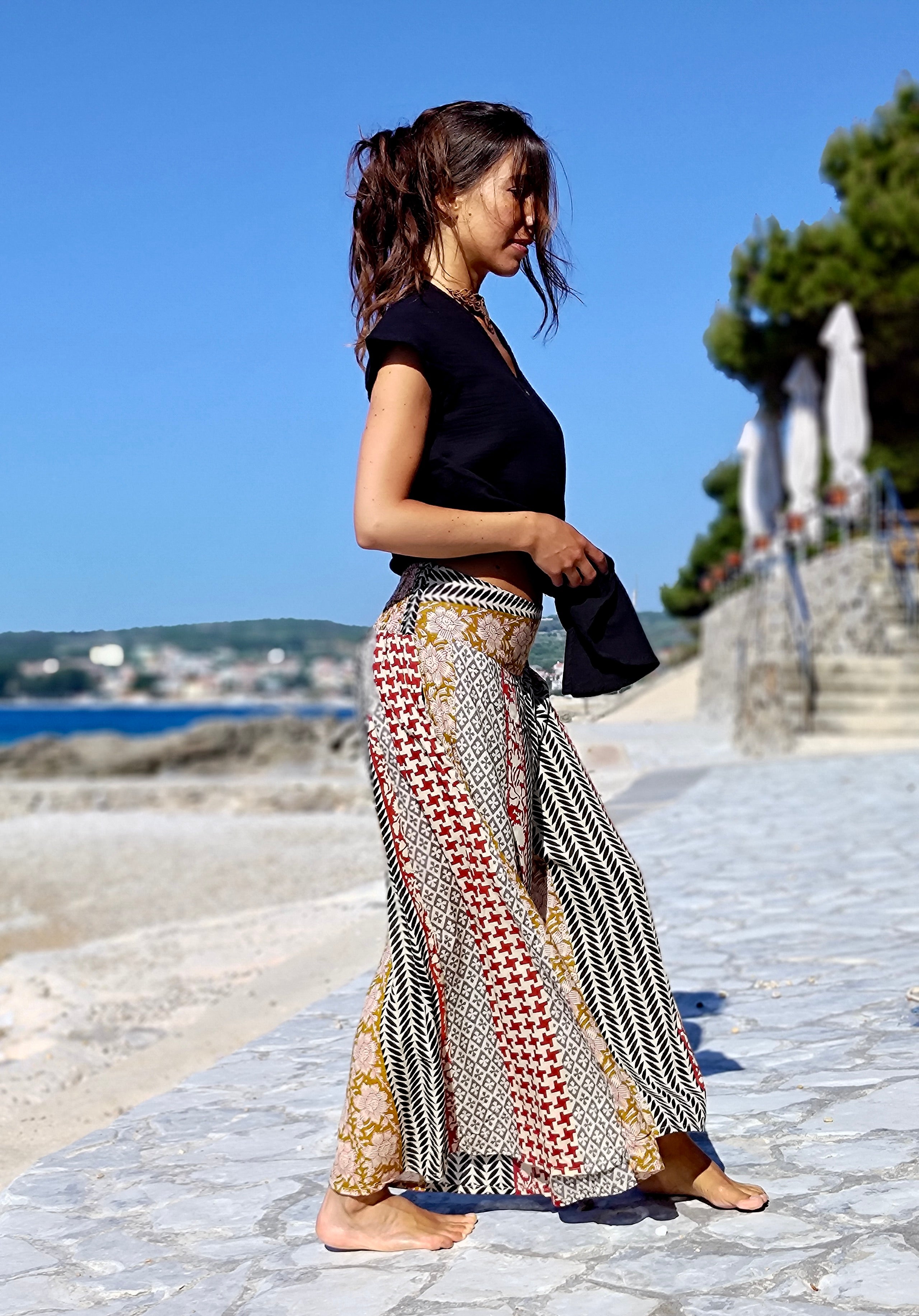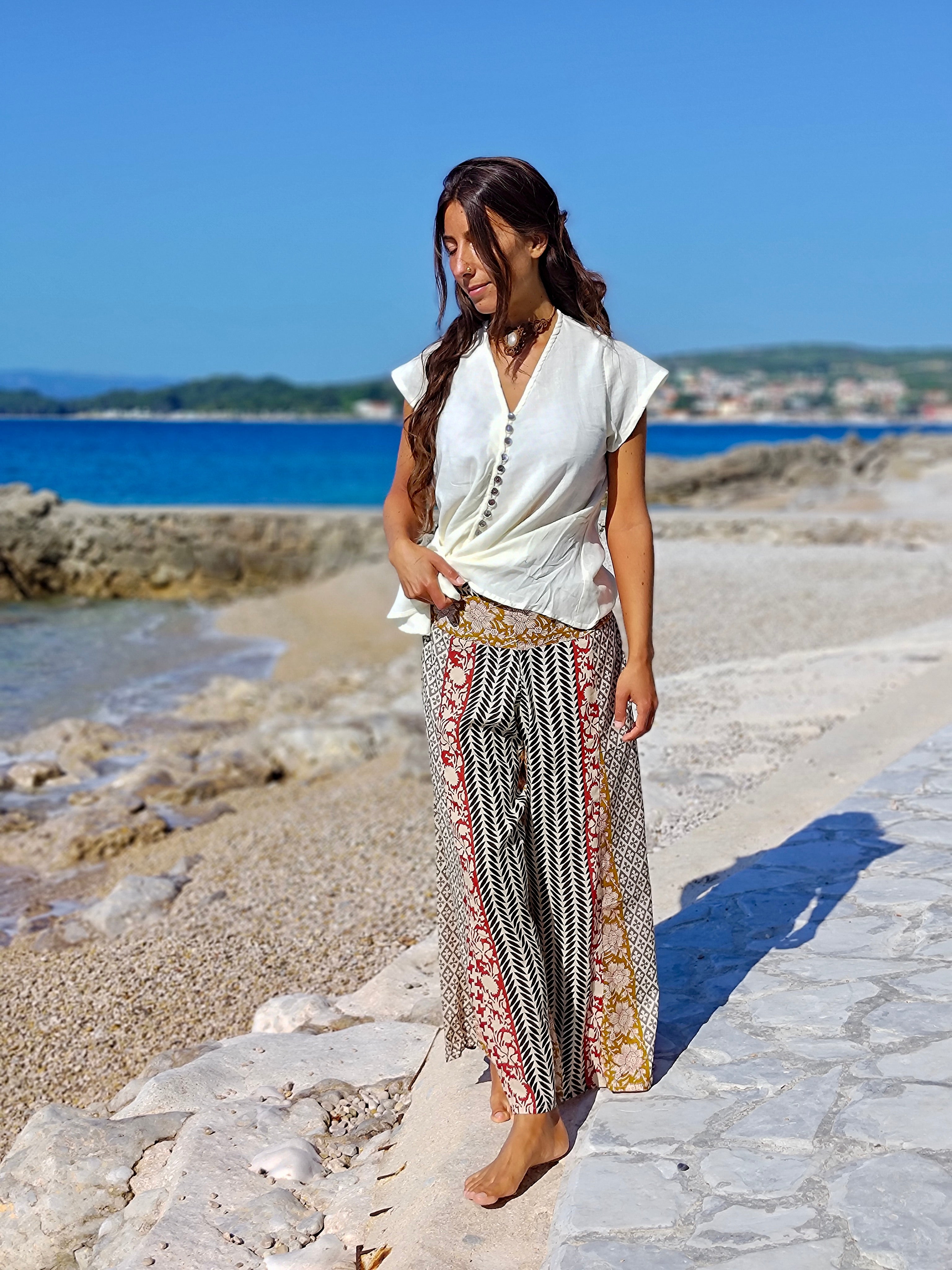 Trousers made from thin cotton, very soft and smooth on skin. Special kind of block print, a traditional hand printing style from India made with wooden patterns that are printed on the fabric. These trousers are very comfortable, you won't even notice you are wearing them. Relaxed and casual style, perfect for moving around or an exercise time, light stretching like Yoga and Thai Chi. Comes in one size, with bobbin elastic waist to accommodate most sizes. You can measure you favourite ones at home and compare to ours to determine will they fit you.