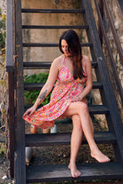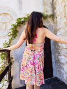 A short summer dress, very light and airy, perfect item for hot summer days. You can combine it for a special evening occasion, a day to day look or a time on the beach. This dress is a free size, the strings are tied around the neck and waist. It comes in different patterns in polyester material. This type of polyester is high quality, an imitation of silk, while at the same time it is cruelty free, light and doesn't stick to the skin.